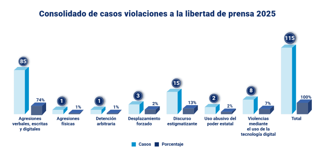 Durante el año 2025, la FLED documentó 115 violaciones a la libertad de prensa, lo que confirma la “continuidad de un patrón sistemático de agresiones contra periodistas y medios de comunicación independientes”, según el informe.