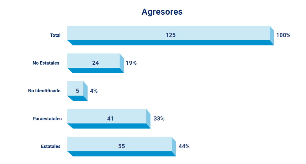 El informe también identifica 125 “agresores identificados”, de los cuales el 44% corresponde a actores estatales, con 55 casos, lo que confirma el papel central del Estado en las agresiones contra periodistas y medios.